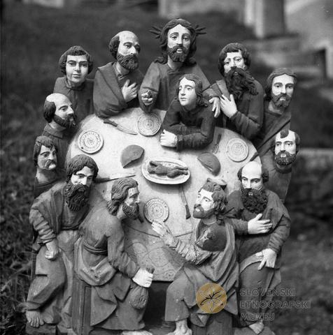 "Zadnja večerja", lesena plastika - ljudsko umetniško delo preprostega pastirja. Narejeno iz enega kosa. Višina 50 cm. Sedaj v oknu (v zidu). Podpleče 9, pri Dolencu.